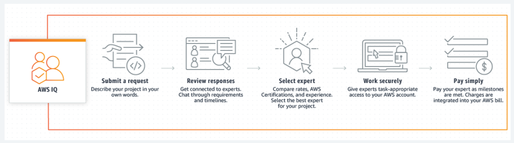 The diagram below shows how AWS IQ works for customers, from submitting a request, reviewing expert responses, selecting an expert, working securely, and paying your expert.