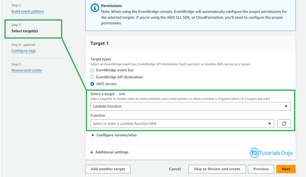Step 5: We can then configure the EventBridge rule to publish events to a Lambda function. After selecting the targets and reviewing the rule, you can now click ‘Create Rule‘.