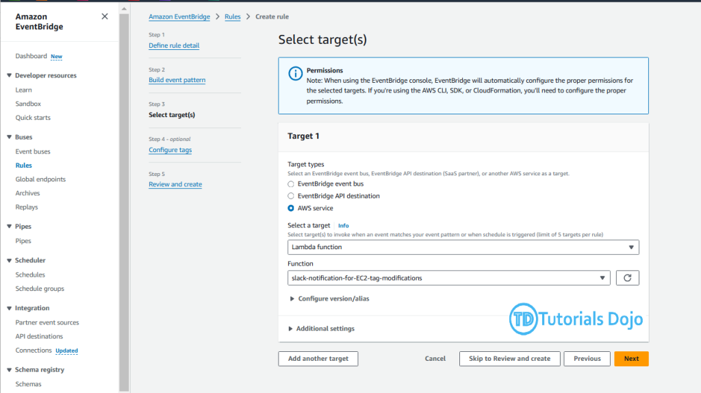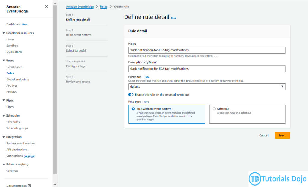 Step 3: Go to Amazon EventBridge, under Buses, choose Rules, then click “Create rule“.